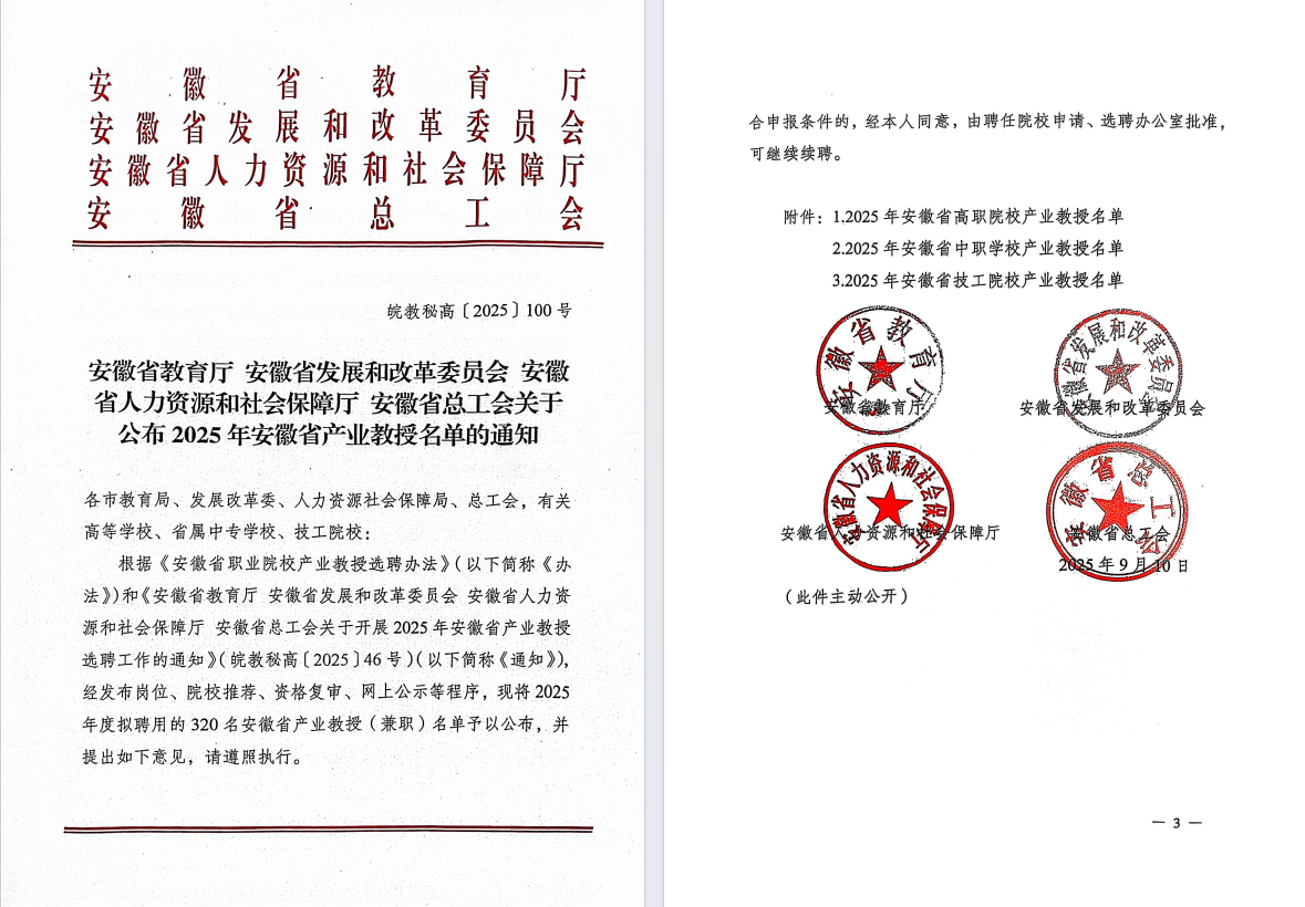 根據(jù)《安徽省教育廳 安徽省發(fā)展和改革委員會(huì) 安徽省人力資源和社會(huì)保障廳 安徽省總工會(huì)關(guān)于公布2025年安徽省產(chǎn)業(yè)教授名單的通知》(皖教秘高〔2025...